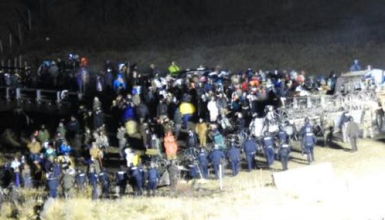 At least one person was arrested. Protesters said a gym in Cannon Ball was opened to aid demonstrators who were soaked on a night the temperature dipped into the low 20s or were hit with tear gas.