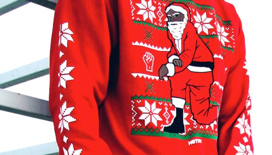 The special edition sweater comes in red, black and green, and St. Nick’s kneeling position is a nod to San Francisco 49ers quarterback, Colin Kaepernick, and his controversial decision to kneel during the national anthem at NFL games in an effort to protest police brutality.