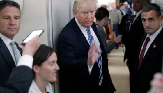President Donald Trump gestures after speaking to members of the media aboard Air Force One before his departure from Andrews Air Force Base, Md., Saturday, May 13, 2017.