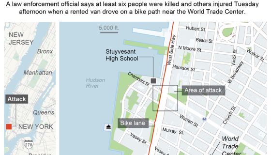 Police said the vehicle, a rented Home Depot truck, entered the bike path at about 3 p.m. on West Street a few blocks from the new World Trade Center — the site of the deadliest terror attack in U.S. history — and mowed down several people. The truck then turned at Chambers Street, near the trade center site, hitting the school bus and injuring two adults and two children.