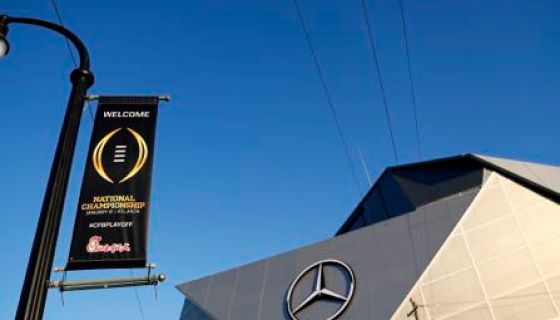 A banner for the NCAAA college football championship game decorates a lamppost next to Mercedes-Benz Stadium, Thursday, Jan. 4, 2018, in Atlanta.