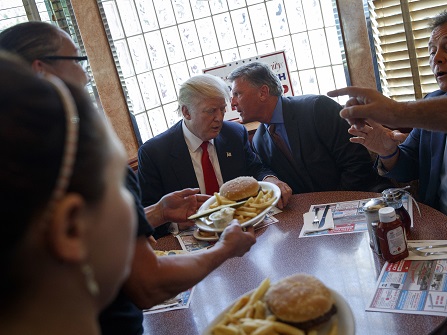 As for his diet, Trump enjoys fast food, steaks well-done and with ketchup, chocolate cake and double scoops of vanilla ice cream, and reportedly downs 12 Diet Cokes a day. In a series of interviews last year, Trump showed journalists how he summons a butler to bring him a soda by pressing a red button on his Oval Office desk. In a recent book, “Let Trump Be Trump,” former top campaign aides Corey Lewandowski and David Bossie described the four major food groups on Trump’s campaign plane as “McDonald’s, Kentucky Fried Chicken, pizza and Diet Coke.”