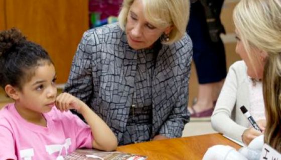 DeVos sat down on the carpet with children during a first grade’s morning meeting as students shared stories of how their friends helped them overcome difficult situations and feel better. In another classroom, she assisted a girl in reading a book about Ruby Bridges, the first African-American child who attended an all-white school in Louisiana during the segregation era. DeVos then joined another class where children were writing essays about the things they wanted to invent. One girl told DeVos about making a special pencil sharpener.