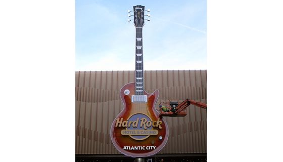 Those who remember the heavy-handed decorating taste of Donald and Ivana Trump from the Taj Mahal days won’t recognize the place: The row after row of chandeliers dominating the view as patrons would ride the main escalator down to the casino floor are gone, supplanted by a giant silver illuminated guitar suspended from the ceiling. Video screens surrounding the escalators play clips of Bruce Springsteen, Eric Clapton, Nirvana and Johnny Cash as customers descend to the casino floor.