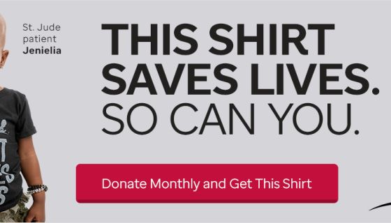 Become a “Partner in Hope” by pledging just $20 a month to help kids at St. Jude Children’s Research Hospital. When you become a Partner In Hope, you will get the This Shirt Saves Lives t-shirt to wear as a reminder that you joined the lifesaving mission of St. Jude. Click the link below or donate by phone using the number 1-800-411-9898.