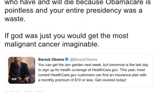 Over the weekend, Justin Lecea retweeted an Obama post reminding people about the deadline for enrollment in Obamacare. He added the message: “I just want you to think about all the people who have and will die because Obamacare is pointless and your entire presidency was a waste,” he wrote, and added “If god was just you would get the most malignant cancer imaginable.”