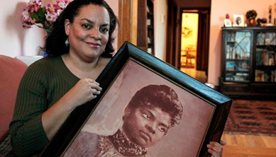 Michelle Duster, great-granddaughter of civil rights pioneer Ida B. Wells who led a crusade against lynching during the early 20th century, holds a portrait of Wells in her home in Chicago’s South Side. (AP Photo/Charles Rex Arbogast, File)
