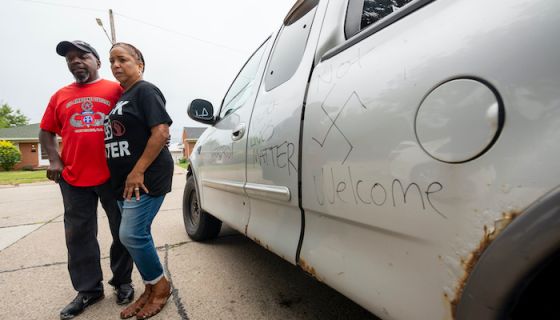 Eddie Hall Jr. and his wife Candace stand in front of threatening graffiti on their truck outside their Warren home, September 10, 2020. In an attack on the home Wednesday evening, a large rock was thrown through the front window, racial threats were written on their car and several tires were slashed. (David Guralnick / The Detroit News)