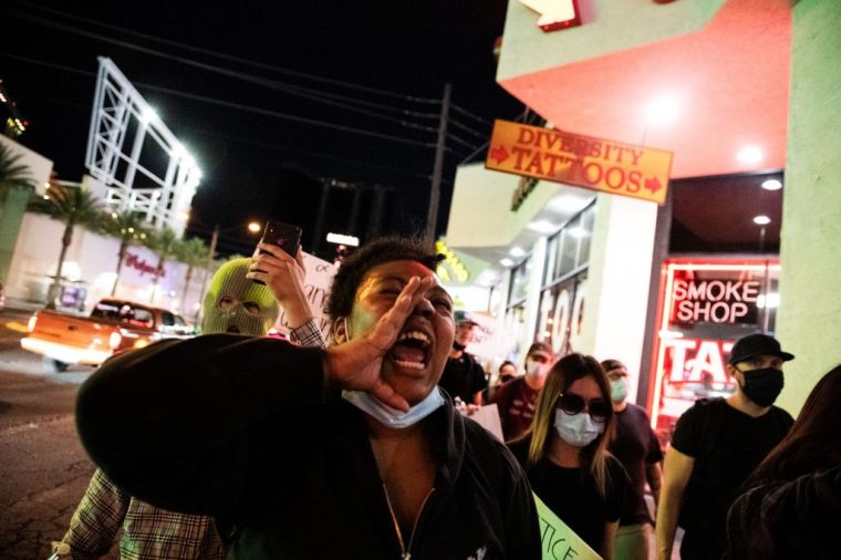 A demonstrator shouts slogans, on June 1, 2020, in downtown Las Vegas, during a “Black lives matter” rally in response to the recent death of George Floyd, an unarmed black man who died while in police custody. – Thousands of National Guard troops patrolled major US cities after five consecutive nights of protests over racism and police brutality that boiled over into arson and looting, sending shock waves through the country. The death Monday of an unarmed black man, George Floyd, at the hands of police in Minneapolis ignited this latest wave of outrage in the US over law enforcement’s repeated use of lethal force against African Americans — this one like others before captured on cellphone video. (Photo by Bridget BENNETT / AFP) (Photo by BRIDGET BENNETT/AFP via Getty Images) photography,horizontal,usa,adult,topix,men,city,night,death,new,nevada,las vegas,shouting,city life,social issues,army,police force,conflict,violence,downtown district,sending,political rally,protest,racism,armed forces,protestor,shock,arson,placard,boiled,national guard,racial tensions,looting,black lives matter,social movement,george floyd