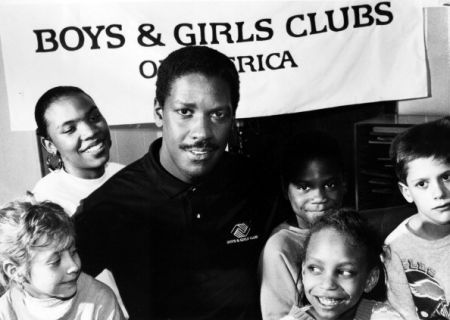 A head and shoulders portrait of actor Denzel Washington with a group of children from the Boys & Girls Clubs of America, 1993. (Photo by Afro American Newspapers/Gado/Getty Images) people,horizontal,usa,waist up,portrait,actor,males,child,north america,1990-1999,black and white,denzel washington,human interest,boys and girls club of america,photograph