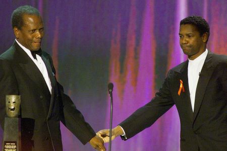 US actor Sidney Poitier (L) is congratulated by actor Denzel Washington (R) as he accepts the Life Achievement Award at the Sixth Annual Screen Actors Guild Awards (SAG) in Los Angeles, 12 March 2000. (ELECTRONIC IMAGE) AFP PHOTO /Lucy NICHOLSON/ln (Photo by LUCY NICHOLSON / AFP) (Photo by LUCY NICHOLSON/AFP via Getty Images) photography,arts culture and entertainment,horizontal,usa,actor,movie,film industry,california,city of los angeles,american culture,denzel washington,awards ceremony,receiving,screen actors guild,screen actors guild awards,sidney poitier,lifetime achievement award,trophy – award