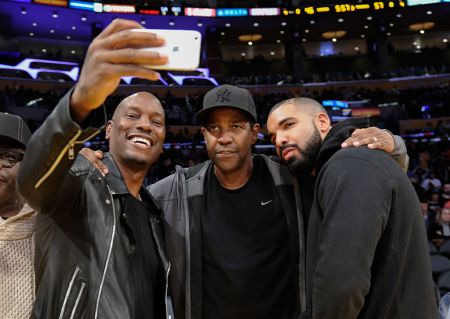 LOS ANGELES, CA – DECEMBER 23: (L-R) Tyrese Gibson, Denzel Washington and Drake take a selfie at a basketball game between the Oklahoma City Thunder and the Los Angeles Lakers at Staples Center on December 23, 2015 in Los Angeles, California. (Photo by Noel Vasquez/GC Images) photography,celebrities,people,arts culture and entertainment,horizontal,usa,waist up,portrait,sport,california,city of los angeles,males,three people,basketball – sport,photography themes,selfie,drake – entertainer,denzel washington,los angeles lakers,match – sport,tyrese,2015,nba pro basketball,oklahoma city thunder – basketball team,crypto.com arena