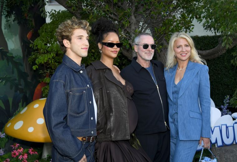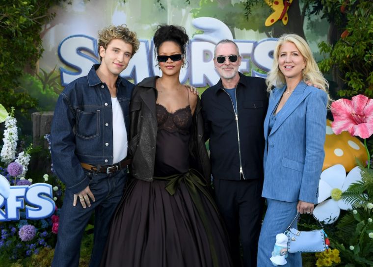 Rihanna was glowing in a chocolate-brown Yves Saint Laurent ensemble — a lace-trimmed top and dramatic ball-skirt paired with a leather moto jacket and sculpted updo. The entertainer voices Smurfette in the upcoming Paramount Animation film, set to be released in theaters July 18. The mom of two walked hand in hand with her stylish miniature runway partners. RZA wore a pink button-up with tie and dark green cargo pants.